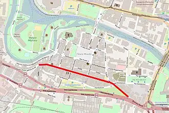The street is located in the heart of the Old Town. It extends approximately on an east–west axis, from the Zbożowy Rynek ("grain market") near southern tip of Bernardyńska Street to Wool Market square (Polish: Wełniany Rynek). It is approximately 650 metres (2,130 ft) long.