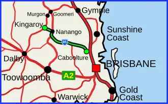 The D'Aguilar Highway is a two-lane highway linking the Bruce Highway near Caboolture with the Bunya Highway in Kingaroy in the state of Queensland, Australia. Major towns along the route include Woodford, Kilcoy, Blackbutt, Yarraman, and Nanango. The highway is approximately 164 km (102 mi) in length. The D'Aguilar Highway's highest elevation along its length is 527 m just north of Yarraman, and the lowest point is at 26.8 m just west of Caboolture.[1]