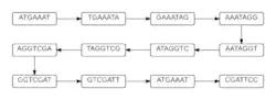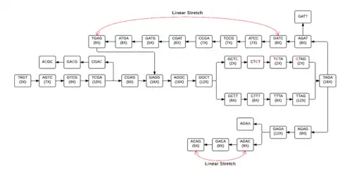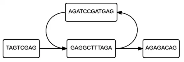 Each individual cell of the table will then form a node, allowing a de Bruijn graph to be formed from the given k-mers. In figure 2, linear stretches are identified and then another graph, figure 3, is formed where the linear stretches have become a single node, of a different k-mer size, allowing for a more concise graph. In this simplified graph, it is easy to identify various tips and bubbles, as shown in figure 4. These bubbles and tips can then be removed, since we can identify that they were formed from errors in the bp reads, giving us a graph structure that should accurately and completely reflect the original sequence.[4] If you follow the de Bruijn graph shown in figure 5, you will see that the sequence formed does indeed match the DNA sequence given in sequence 2.