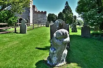 Historic England dates the Dacre Bears to the medieval period and records them as each standing about 4 ft high and carved from Red sandstone, which is now heavily weathered.[1] It suggests that their present placement is original, at each of the four corners of the medieval churchyard.[2][a][b] The bears were first studied in the 18th century by William Nicolson, Bishop of Carlisle who was also a keen amateur antiquary. It was Nicolson who first deemed the sculptures to represent bears, suggesting they were a heraldic device showing the Bear and Ragged Staff emblem of the Earls of Warwick. However, the statues long predate the emblem.[5] In the 19th century the bears were studied and described by Richard Saul Ferguson, another local antiquarian, who also served as the chancellor of the Diocese of Carlisle.[6] Ferguson suggested that the statues tell a story. Beginning with the bear in the north-west corner of the churchyard and moving south-west, south-east and finally north-east, Ferguson contended that the first sculpture represented a bear in repose; the second, the bear turning its head as a small, cat-like, animal attacks it by climbing onto its back; the third a struggle between the two; and the fourth, the bear, victorious and replete, with a satisfied smile on its face having overcome and eaten its enemy.[5] A recent archaeological survey disputes Historic England's dating, suggesting instead that the sculptures predate the Anglo-Saxon period and may represent evidence of a pagan religious site.[6] Close study of the fourth sculpture has also called into question the identification of the statues as bears. The best-preserved of the quartet, it appears to have a mane and a tail, suggesting that the statues may have been intended to depict lions.[7][c]