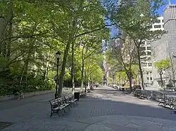 In 2000, a weekly greenmarket was added to the park, which continues to be held each Wednesday and is managed by GrowNYC.[46][47][48] The following year, a small cafe opened in a private concession space near the eastern end of the park that was designed by NYC Parks to resemble a glass greenhouse.[49] By the 21st century, Katharine Hepburn's birthday was celebrated at the park's Katharine Hepburn Garden annually.[50]