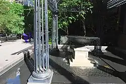 In the early 1990s, NYC Parks made plans for a $2.5 million expansion and renovation of the park, which would include removing the elevated sculpture garden at the west end of the park and the eastbound roadway on East 47th Street. These plans were met by opposition from some of the local residents, who said the plaza had become overrun by homeless in the prior decade and did not want homeless encampments to grow larger.[33][34] Homeless persons had congregated in the sculpture garden at the park's western end, which was no longer displaying sculptures and was seen as a security risk by local residents.[35] In 1993, Friends of Hammarskjold Park was formed as a community organization to address concerns that these problems would continue in a new and expanded park.[33][34][36] The renovations to Dag Hammarskjöld Plaza were designed by NYC Parks architect George Vellonakis and included six fountains within reflecting pools, steel lattice pavilions and colonnade, and new landscaping and benches.[2][37][38][39]