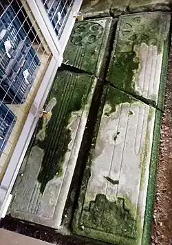 Possibly the tomb of a married couple, donors to the abbey who were buried there. Both sides have an incised cross. One has a pair of shears, the other a sword and a shield, possibly with a horseshoe, suggesting a knightly family.