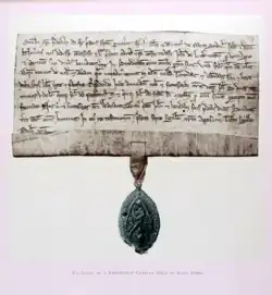 The Cartulary of Dale Abbey, containing records of grants made to it over several centuries, runs to 172 folios and forms part of a 196-page volume in the Cotton library, part of the British Library, that also contains Muskham's chronicle and a list of abbots. It consists of transcripts of about 530 deeds.[56][57] The great majority date from the 13th century, with a few from the preceding century and only two that are known to be later.[58] Information about later acquisitions comes from other sources: letters patent, for example, give considerable detail about the acquisition of land and appropriation of churches from the 14th century.