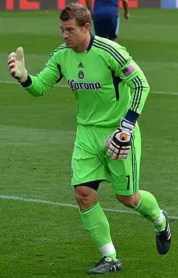 Kennedy remained the starter until Chivas folded after the 2014 Major League Soccer season.[30] He finished in second place for the 2012 MLS Goalkeeper of the Year Award despite Chivas USA's last-place finish and participated in the 2012 MLS All-Star Game.[30][31] In May 2013, he signed a contract extension with Chivas and Major League Soccer through the 2016 season.[32] Francisco Palencia, the Chivas technical director, said of Kennedy at the time of the signing, "He's our captain and our symbol at this moment, so we're very happy to extend this contract."[30][33] Kennedy celebrated his new contract by scoring his first professional goal on May 28, 2013, on a penalty kick in the 2013 Lamar Hunt U.S. Open Cup against Los Angeles Blues.[34]