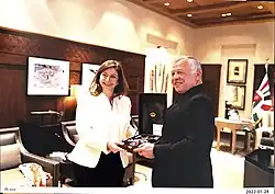 She serves as the President of the Board of Directors of Petra National Trust[3][4][5] and is a liaison with The Royal Hashemite Court and Jordanian government ministries.[6] She was named a UNESCO Goodwill ambassador in June 2017 by the UNESCO Director-General Irina Bokova.[7][8] Her advocacy for the cause of cultural heritage preservation and awareness resulted in their inclusion in two World Tourism Organization declarations[9][10][11][12] She presides over the Board of Trustees of the Petra National Trust[13] and is the elected president of the Jordan National Committee of the International Council on Monuments and Sites.[14] She served as an invited expert to the international board of ICOMOS from 2020-2023. In the triennial General Assembly meeting of ICOMOS in Sydney Australia, Princess Dana was formally elected to the board as Vice President.