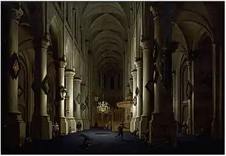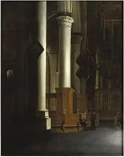 His imaginary architectural paintings of church interiors were in the style of the Flemish painter Hendrick Aerts, but under the influence of architectural painters of the Delft school such as Hendrick Cornelisz. van Vliet, he developed a more realistic style around 1650.[6] His painting of the Rotterdam St. Lawrence Church of the early 1650s demonstrates this interest in realism.[7] However, he did not abandon the style of imaginary architecture paintings[6] and it has been claimed that he never found his own style.[8]
