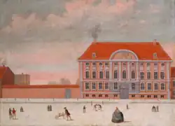 Ferdinand Anton Danneskiold-Laurvig was the son of Ulrik Frederik Gyldenløve. When his father died in 1704 he inherited Gyldenløve's Little Mansion at the corner of Dronningens Tværgade and Bredgade as well as the County of Laurvig in Norway.[1] He purchased a number of smaller lots in Store Kongensgade in the 1720s. It is unclear when the building at Store Kongensgade was built. Most sources state that it was most likely built to a design by Johann Adam Soherr in circa 1745. Ida Haugsted states that it was more likely built in circa 1720-30 to designs by Johan Cornelius Krieger. Krieger was also responsible for adapting the Gyldenløbe Mansion. A garden connected the two buildings and the new building in Store Kongensgade was referred to as Danneskiold-Laurvig's backyard" (Danneskiold-Laurvig's baggård). The new building was also known as Jernmagasinet ("The Iron Store") since stoves and other products from Danneskiold-Laurvig's extensive Fritzøe ironworks in Laurvig in Norway were sold from its ground floor.[2]
