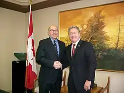 Williams' popularity increased when he fought with then Canadian Prime Minister Paul Martin over a campaign promise Martin had made that would lead to a revised Atlantic Accord.[23] Martin proposed an eight-year deal that the province would keep 100 percent of offshore oil revenues, but with a cap to keep the province from surpassing the per capita tax revenue of Ontario. Williams, supported by the other provincial leaders, walked out of talks with Martin, saying that cap would cost the provincial government billions of dollars in lost revenue over the life of its three oil fields.[23][24] Williams along with Nova Scotia Premier John Hamm, who also wanted the same deal as Newfoundland and Labrador, met with the Prime Minister on several occasions but a deal between Ottawa and the two provinces could not be reached.[25] Williams raised the temperature on December 23, 2004, when he ordered the removal of all Canadian flags from provincial government buildings.[26][5][27] On January 10, 2005, Canadian flags started flying once again in the province, and several weeks later Newfoundland and Labrador and Nova Scotia reached a deal with Ottawa.[28][29][30] A March opinion poll indicated that support for the Williams government had rebounded to 86 percent.[31]
