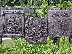 The Dante Garden or the Dante Sculpture Park is a sculpture garden located on the campus of the University of St. Michael's College in Toronto, Ontario. The garden consists of 100 bronze page-like relief sculptures created by Canadian sculptor Timothy Schmalz, making him the first artist to represent the full poem through sculpture.[1] Each of the sculptures depict a single scene from each canto of Dante Alghieri's Divine Comedy, creating an "open-air book". In the center of the garden is a life-sized sculpture of Dante hunched over, appearing to write the first canto which he holds in his hand.[2]