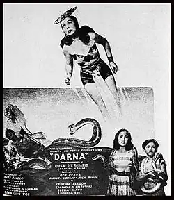 Darna is the first film featuring the Pilipino Komiks character Darna. The film was released on May 31, 1951, by Royal Films. It was directed by Fernando Poe Sr.[1] and written by Mars Ravelo, the creator of Darna. Long thought to be entirely lost, Howie Severino and his crew from i-Witness discovered in 2005 an incomplete copy of the film in Thailand lasting 40 minutes, with audio removed, and only featuring scenes of the villain Valentina.[2][3]