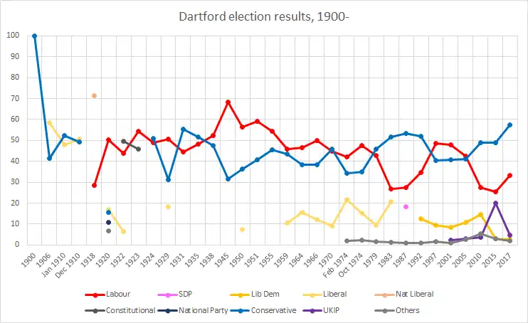 In the early 20th century, the Dartford constituency was very much a bellwether. Dartford's results later shifted towards the left: in a by-election in 1938 and then in the general elections from 1951 to 1959, a Labour candidate won, going against the national result.