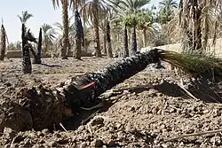 In order to multiply the number of fruit-bearing trees traditional offshoot propagation is practised all along the Nile in Sudan. Lower offshoots called Shatla (شتلا) develop from axillary buds at the lower trunk of a parent palm and are cut off during early spring season. A well chosen offshoot will not only guarantee a female fruit bearing palm tree but also inherit the same qualities of its mother plant.[5] The date trees in the region of the Fourth Cataract attain an age of up to 150 years and consist most often of multiple shoots from a single clump called Bu'rah or Hufrah (بؤرة or حفرة).[6] Satisfactory date production ceases with an age of 90 to 100 years. With increasing age and height the palm tree becomes more difficult to climb in order to be pollinated and harvested.