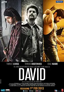 David is a 2013 Indian Hindi-language crime drama film directed by Bejoy Nambiar, starring Neil Nitin Mukesh, Vikram, and Vinay Virmani in the titlular role, alongside Tabu, Monica Dogra, Lara Dutta and Isha Sharvani. An altered version with the same title David featuring a slightly different cast was simultaneously shot in Tamil.[2] The plot revolves around the lives of three different men named David, who are about to take a step which is going to change their lives forever.[3] Both the Hindi and Tamil versions were released on 1 February 2013.
