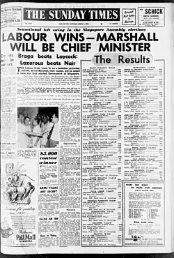 78. ^ "Labour Wins – Marshall Will Be Chief Minister". The Straits Times. 3 April 1955. p. 1. Retrieved 21 June 2025 – via NewspaperSG.