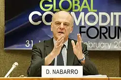 In January 2009, Nabarro took on the responsibility of coordinating the UN system's High-Level Task Force on Global Food Security (HLTF).[11] The HLTF brought together 23 different organizations, funds, programs and other entities from within the UN family, as well as the Bretton Woods Institutions, the World Trade Organization (WTO), and the Organisation for Economic Co-operation and Development (OECD),[12] and tasked them with establishing a common strategy for addressing food and nutrition insecurity in a more sustainable, coordinated and comprehensive way. Nabarro left the HLTF coordinator position in 2014 and was succeeded by Giuseppe Fantozzi.[11]