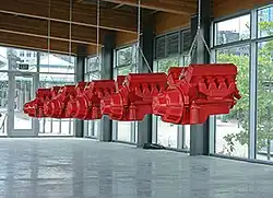 In 2006, a three-month residency at the Kohler Arts/Industry program[10] allowed the artist to realize a significant and ambitious project: full-size cast ceramic sculptures of V8 car engines. This work, called The Last of the V8s, was both more complex and more ambitious than anything he had tried before. In Packer’s own words: “I never thought how appropriate it would be to manufacture a quintessentially American industrial object in a factory setting.”[11] These sculptures were also included in the show The Moment at Hand[11] at the John Michael Kohler Arts Center, as well as subsequently in galleries in New York, Chicago, and Seattle. The predominant use of industrial imagery in such projects and “the never-ending, osmotic flow that underwrites cultural exchange”[7] creates in Packer’s work “a 21st Century elegy for American industrial might” where “the dominant note becomes poignancy.”[12]