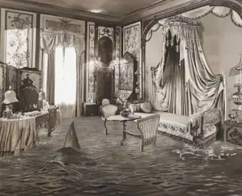 Byington's show "Cassandra: Truth and Madness" (Anglim/Trimble, 2022)—its title a reference to the Robinson Jeffers poem, Cassandra—offered a wider range of work depicting the world as a facade teetering on the brink of collapse in the wake of human activity.[9][2] The "Colossus" series (2022) depicted movie sets built on giant scaffolds towering over vast, carved out tracts of land.[9] Draped in front of the vast sites were curtain-like pastoral scenes resembling the romantic paintings of artists such as Frederic Church.[2] The effect was a layering of two human constructs—idealized landscapes embodying Manifest Destiny that obscured the dark side of American expansionism, placed band-aid-like over the giant open pits of mines—a metaphor for the veiling of devastation that political narratives enact.[2] In other paintings, dystopias invaded cinematic interiors; Oceans (2022) depicted a rising tide with a gliding shark swamping an opulent, Victorian bedroom.[2] Hyperallergic's Gabrielle Selz wrote of the show, "Drawing on the blast sites of the Nevada desert and abandoned scenery of movies like Citizen Kane, Byington’s visual language mingles romance and theatricality with the disastrous consequences of climate change and environmental contamination."[2]