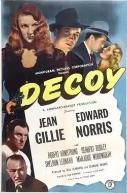 Decoy is a 1946 American film noir starring Jean Gillie, Edward Norris, Robert Armstrong, Herbert Rudley, and Sheldon Leonard. Directed by Jack Bernhard, it was produced by him and Bernard Brandt as a Jack Bernhard Production, with a screenplay by Nedrick Young based on an original story by Stanley Rubin.[1]