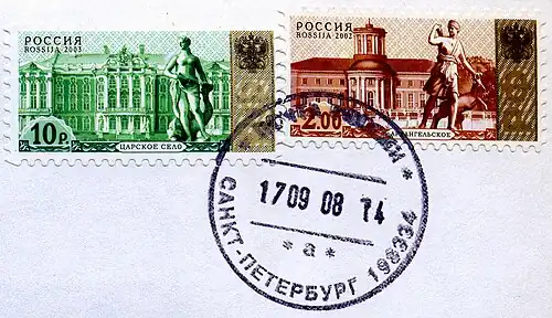 The fourth series of 2002–2003 was different from the previous issues because of introduction of self-adhesive stamps. The new stamp motives included palaces and parks of Russia. Number of denominations was reduced to nine, from 1- to 10 roubles. The problem of fractional postal rates was solved by using the remaining stamps of the third issue.[5][6]