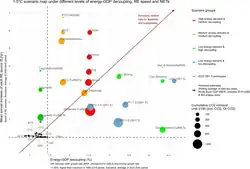 The concept of decoupling denotes decoupling economic growth, usually measured in GDP growth, GDP per capita growth or GNI per capita growth[24] from the use of natural resources and greenhouse gas (GHG) emissions. Absolute decoupling refers to GDP growth coinciding with a reduction in natural resource use and GHG emissions, while relative decoupling describes an increase in resource use and GHG emissions lower than the increase in GDP growth.[25] The degrowth movement heavily critiques this idea and argues that absolute decoupling is only possible for short periods, specific locations, or with small mitigation rates.[26][27] In 2021 NGO European Environmental Bureau called stated that there is "no empirical evidence supporting the existence of a decoupling of economic growth from environmental pressures on anywhere near the scale needed to deal with environmental breakdown", and that reported cases of existing eco-economic decouplings either depict relative decoupling and/or are observed only temporarily and/or only on a local scale, arguing that alternatives to eco-economic decoupling are needed.[27] This is supported by several other studies which state that absolute decoupling is highly unlikely to be achieved fast enough to prevent global warming over 1.5 °C or 2 °C, even under optimistic policy conditions.[28]
