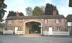 There are two moated sites in the parish, both of which are on Childrey Brook. Denchworth's medieval manor house in the village had a large moat, part of which is still in water. The oldest part of the present house is late 15th or early 16th century. A three-bay wing was added to one side of the house early in the 17th century, and a second wing added to the other side later in the 17th century. The manor house is a Grade II* listed building.[5] Denchworth's other moated site is in the northeast corner of the parish. It is a small, rectangular site about 440 yards (400 m) southeast of Hyde Farm. Just north of the Manor House in the village were Brook Lane Barns; an 18th-century five-bayed barn flanked by shelter sheds. The barn and sheds were timber-framed, had weatherboarded walls and thatched roofs[6] and had been converted into offices.[7] Brook Lane Barns were destroyed by fire in the early hours of 11 March 2012.[7]