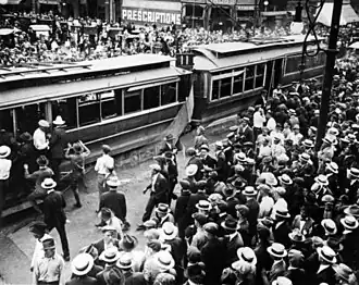 The Denver streetcar strike of 1920 was a labor action and series of urban riots in downtown Denver, Colorado, beginning on August 1, 1920, and lasting six days. Seven were killed[1] and 50 were seriously injured in clashes among striking streetcar workers, strike-breakers, local police, federal troops and the public. This was the "largest and most violent labor dispute involving transportation workers and federal troops".[2]