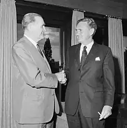 Prime Minister John McEwen with John Gorton on 9 January 1968. The following day, Gorton was sworn in as prime minister, and McEwen became the inaugural deputy prime minister.