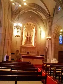 At the altar is a major sculptural group of the Crucifixion by John Angel, the British-born sculptor, medallist, and lecturer.[12]