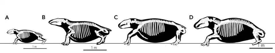 Desmostylians were large, fully aquatic quadrupeds with massive limbs and short tails.[2] The smallest is Ashoroa laticosta, a relatively large animal at a body length of 168 centimetres or 5 feet 6 inches, while the largest species reached sizes comparable to Steller's sea cow.[6]