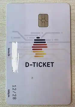 The Deutschlandticket (lit.'Germany ticket'), often D-Ticket, is a subscription public transport ticket for all local public transport, valid in the whole of Germany. The Scholz cabinet introduced it in May 2023 as a successor to the temporary 9-Euro-Ticket which had been offered in Summer 2022. The German federation (Bund) and the federal states (Länder) initially participate in the financing with 1.5 billion euros per year until 2025.[1] The price was €49 for one calendar month, increased to 58 in January 2025.[2]