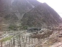 Diamer-Bhasha Dam is a concreted-filled gravity dam, in the preliminary stages of construction, on the River Indus between Kohistan district in Khyber Pakhtunkhwa and Diamer district in Gilgit Baltistan, Pakistan administered Kashmir. Its foundation stone was laid by the then Prime Minister of Pakistan in 1998. The dam site is situated near a place called "Bhasha", hence the name which is 40 km downstream of Chilas town and 315 km from Tarbela Dam. The eight million acre feet (MAF) reservoir with 272-metre height will be the tallest roller compact concrete (RCC) dam in the world.[2]