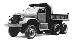 The dump had a 12 feet (3.7 m) long 4 cubic yards (3 m3) steel body that was raised and lowered by a hydraulic cylinder and lever arrangement under the body. A power take-off on the transfer case, used with the transmission in gear, drove the hydraulic pump, the controls were inside the cab. The body had a tailgate that hinged from either the top or bottom. When the tailgate was hinged at the top the bottom could be opened while dumping with a lever on the left front corner of the body, just behind the driver's window. The front of the body had a stone-shield that covered the cab and the spare tire mounted between the cab and body.[26][27]