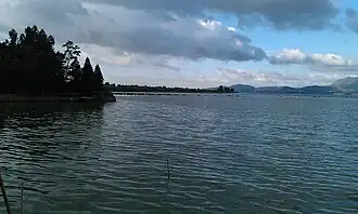 Dian Lake (Chinese: 滇池; pinyin: Diānchí), also known as Dianchi, Dianchi Lake, Lake Dian and Kunming Lake, is a fault lake located on the Puduhe-Xishan fault in Kunming, Yunnan, China at 24°23′–26°22′ N, 102°10′–103°40′ E. Its nickname is the "Sparkling Pearl Embedded in a Highland" (Chinese: 高原明珠; pinyin: Gāoyuánmíngzhū).[1] It is the model for the Kunming Lake in Beijing's Summer Palace. Its name is the source of Yunnan's Chinese abbreviation 滇.