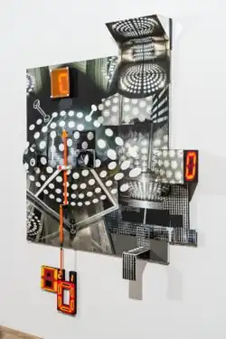 Digital photography and themes involving the built environment play a greater role in Cooper's later work, which has employed fewer elements and sometimes taken on a frieze-like appearance (e.g., the illusionistic wall-piece, Undercover, 2010–3).[47][48][49] She uses photography to create sketchbook-like collections of abstract forms taken from everyday experience—details of airport tarmacs, subway seats, grass, refuse, construction fencing, or gallery architecture—which she re-presents out of context, revealing neglected qualities of beauty and strangeness or to create hyperreal spatial illusions (e.g., Skylight I, 2012–3).[47][23][20] Jerry Saltz described her 2013 show, "My Eye Travels," as "a florid blaze of color, pattern, abstraction, and images of bits of the world," composed almost entirely of photographs "assembled into fragmenting mandalas of contemporary energy."[23]