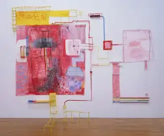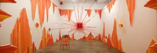 In the 2000s, Cooper expanded her practice to include furniture-like sculptures and full installations that increasingly colonized their exhibition spaces.[41][42][43][44] Speedway (2000–3) was a freestanding, De Stijl-styled foamcore structure, consisting on one side of a cutaway that Nancy Princenthal described as "a Las Vegas marquee of pulsing concentric and parallel lines, punctuated by seedily alluring little niches,"[45] and on the other, a dollhouse-like grid of cubbyholes, suggesting a Mondrian/Donald Judd-influenced "mini-museum."[7][35] The mutating, increasingly elaborate installation Orange Alert UK (2003–8) employed taut linear arrangements of vivid reds, oranges and yellows, initially inspired by the color-coded, post-9/11 terrorist alert system, which formed cardiograph-like wall patterns and radiated from a central, spider-like form.[25][31][1][46]