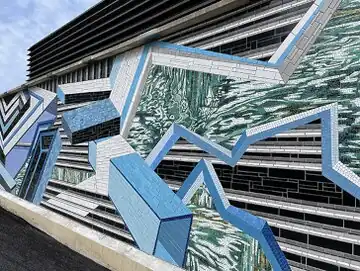 For HighWire (2016, Moss Arts Center), Cooper developed her concept and imagery digitally, combining scans of her drawings with data visualization imagery alluding to micro- and macro- organic and technological systems. She printed the scans on PhotoTex—a repositionable adhesive material similar to that used in commercial signage—then hand-painted over them, reimagining the data as a lyrical, six-walled, 17-foot-tall, 116-foot-long landscape.[51][15] In 2023, MTA Arts and Design unveiled Cooper's commissioned permanent public mural, Double Take, an 8-by-96-foot, glass mosaic, ceramic, granite and aluminum work located on Roosevelt Island.[20][52] Her design marries geometric forms found in the location's ventilation building, the Queensboro Bridge and other surrounding structures with fluid hand-drawn and organic forms reflecting the natural setting and backdrop of the East River.[52][53][54]