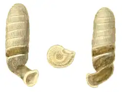 | Drawing of apertural, umbilical and abapertural views of a shell of Diaphera cumingiana. | |
