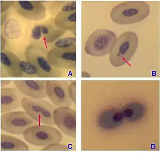 - ^ a b c d e Anbumani, S.; Mohankumar, Mary N. (2015-08-12). "Nucleoplasmic bridges and tailed nuclei are signatures of radiation exposure in Oreochromis mossambicus using erythrocyte micronucleus cytome assay (EMNCA)". Environmental Science and Pollution Research. 22 (23): 18425–18436. doi:10.1007/s11356-015-5107-1. ISSN 0944-1344. PMID 26263884. S2CID 21454141.