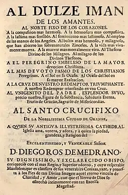 "Posthumous Acclamation. Immortal fame. Panegyric trumpet of virtues. Funereal trumpet of examples, and of disillusionments, with which the Most Illustrious Chapter of the Holy Cathedral Church of the city of Orense publicly announced to the world the loss of the most famous hero ... D.D. Diego Ros de Medrano ... The mournful panegyric of such loss was pronounced last year of 94." - by Dr. Jacinto Andres Phelipes (Granada, 1714)[18][19]