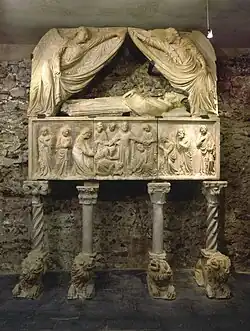 The visit begins underground where archeological finds from the region are displayed. The oldest items in the museum's collection are found here and include a comb made out of bone from the 4th-6th centuries, as well as a fragment from a Roman sarcophagus.[2] Also found here is the funeral monument of Cardinal Luca Fieschi (c.1336) from the school of Giovanni di Balduccio of Pisa.