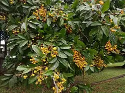 The fruit is a yellow-orange capsule with 2 or 3 segments, each containing a single seed fully surrounded by a thick, translucent, yellow/orange, bilobed aril. The seed is brown and about 1 cm (0.39 in) long.[5][6][7]