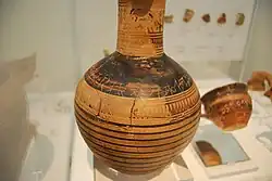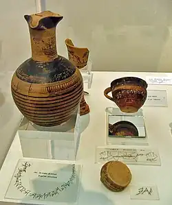 Dipylon oenochoe (left), on display in the National Archaeological Museum, Athens. The inscription is scratched into the dark band around the shoulder of the vase.