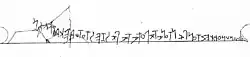 The text is written in an archaic form of the Greek alphabet, with some letter shapes still resembling those of the original Phoenician alphabet. For example, the Greek letter zeta (Ζ) resembles the Phoenician letter zayin (I). The text is written from right to left, with the individual letters mirror-shaped in comparison with the modern forms. It is placed in a circle around the shoulder of the vessel. The text consists of 46 characters, of which the first 35 can easily be read as a hexametric verse in Greek. The fragmentary rest is believed to have been the beginning of the second verse of a distichon , but the exact interpretation is unclear. B. Powell has argued that the final characters may represent a garbled snippet from the middle of an abecedarium (ΚΛΜΝ) by a second hand, someone learning to write.[1] More recently, N. M. Binek has shown that the last six markings can "be viewed not as letters or as attempts to inscribe letters, but rather as decorative elements fashioned by a second inscriber in accordance with the principles of Geometric idiom", inasmuch as the segment roughly mirrors the shapes of letters 9-4 (ΧΡΟΝΥΝ).[2] The text marks the vessel as a prize in a dancing competition. It is translated as: "whoever of the dancers now dances most lightly ...", and the second line is conjectured to have said something to the effect of "... he shall get this (vessel as his prize)".