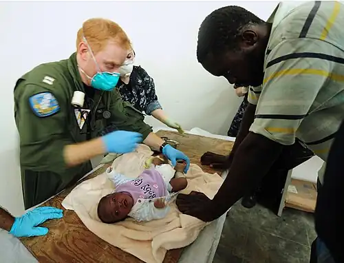 U.S. Navy sailors assigned to the aircraft carrier USS Carl Vinson treat a baby injured by 2010 Haiti earthquake
