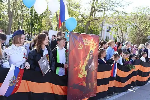 Kremlin claims of Nazism against Ukraine are partly an attempt to drum-up support for the war among its citizens. Russian propaganda has framed it as a continuation of the Soviet Union's "Great Patriotic War" against Nazi Germany, even though Russia supports far-right groups across Europe.[47][48] In the words of Miriam Berger for The Washington Post, "the rhetoric of the 'fight against fascism' resonates deeply in Russia, which suffered huge losses in the fight against Nazi Germany".[49] Some Soviet imagery was used as part of this propaganda drive, and Ukrainian flags were replaced with Victory Banners in some occupied towns.[50][51]