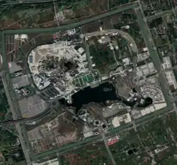 Major construction work started on April 8, 2011, targeting a spring 2016 opening.[4] The resort was planned to cover an area of 4 km2 (1.5 sq mi) and it was expected to cost CN¥ 25 billion (US$3.66 billion).[11] The project is financed by several large Chinese state-owned enterprises in Shanghai forming a joint venture with the Walt Disney Company.[11] "The first-phase of the project will be to the South of Huanglou Area, an area in Chuansha Town, the southeast suburbs of Shanghai's Pudong area; the second phase will extend further southwest," an urban developer from Shanghai stated. DeSimone Consulting Engineers were the structural engineers behind the construction work.[12]