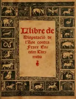 Disputa de l’ase (1417) is a Catalan medieval novel. It is about the discussion between a monk and a donkey about the human superiority over the other animals. The monk wins in the 19th argument, stating that human is superior, because God chose human body for their incarnation. The work was written by Anselm Turmeda, a Majorcan writer and former Catholic friar who lived in Tunis and converted to Islam. It is his longest work in Catalan, his mother tongue. It is of Arabic inspiration,[1] even though it incorporates an important portion of original elements, such as the literary style and a strong feeling of anti-clericalism.