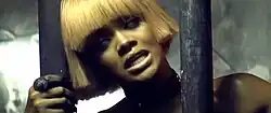 A shot from the music video where Rihanna is seen imprisoned. She is wearing lenses that make her look as if her eyes have rolled into the back of her head.