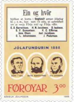 - ^ Debes, Hans Jacob. 1982. Nú er tann stundin ...: tjóðskaparrørsla og sjálvstýrispolitikkur til 1906, við søguligum baksýni. Tórshavn: Føroya skúlabókagrunnur, pp. 217–225.